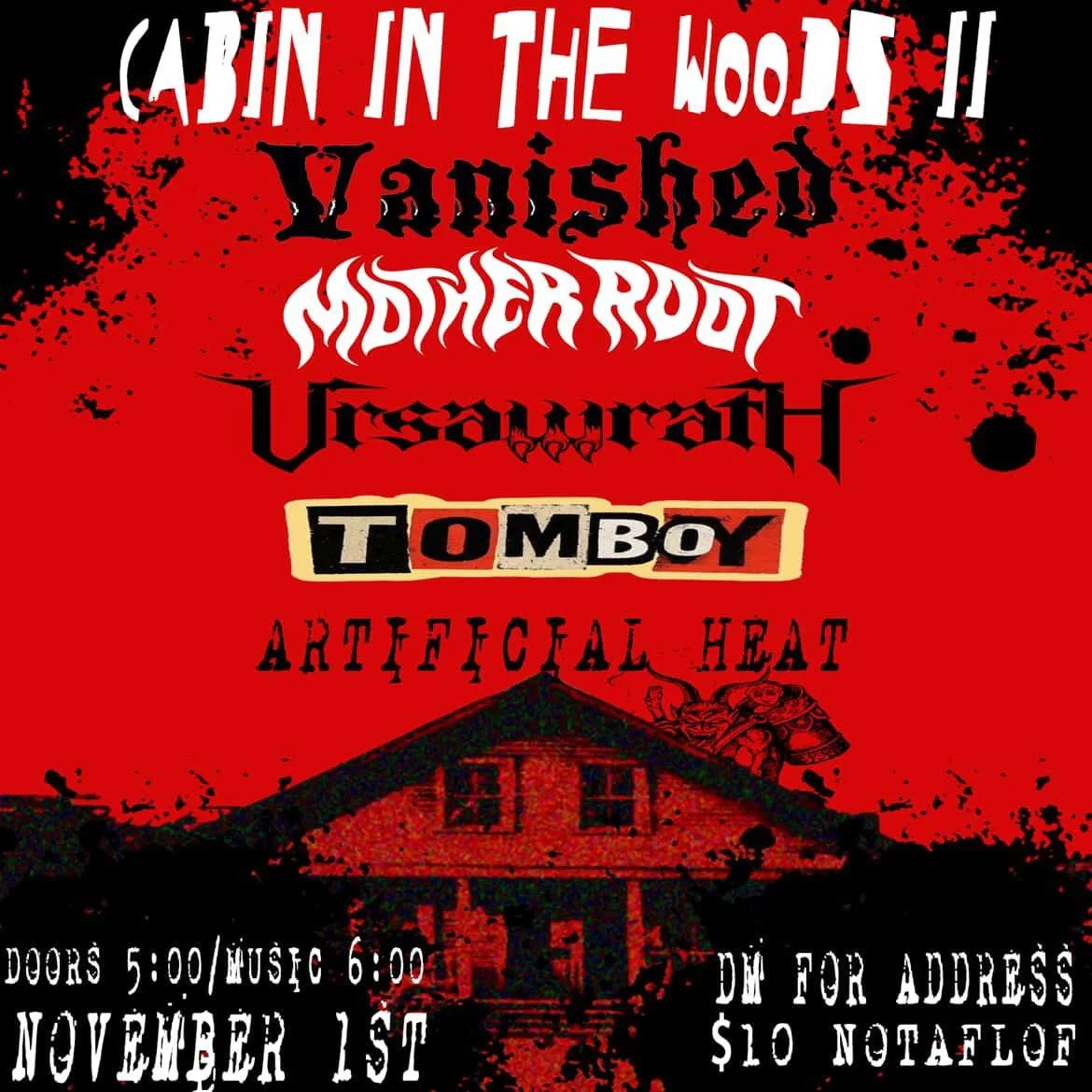 Nov 1 Vanished, Mother Root, Ursawrath, Tomboy, Artificial Heat Saturday, November 1, 2025 7:00 PM 8:00 PM Contact for Address (map) Google Calendar ICS View Event →